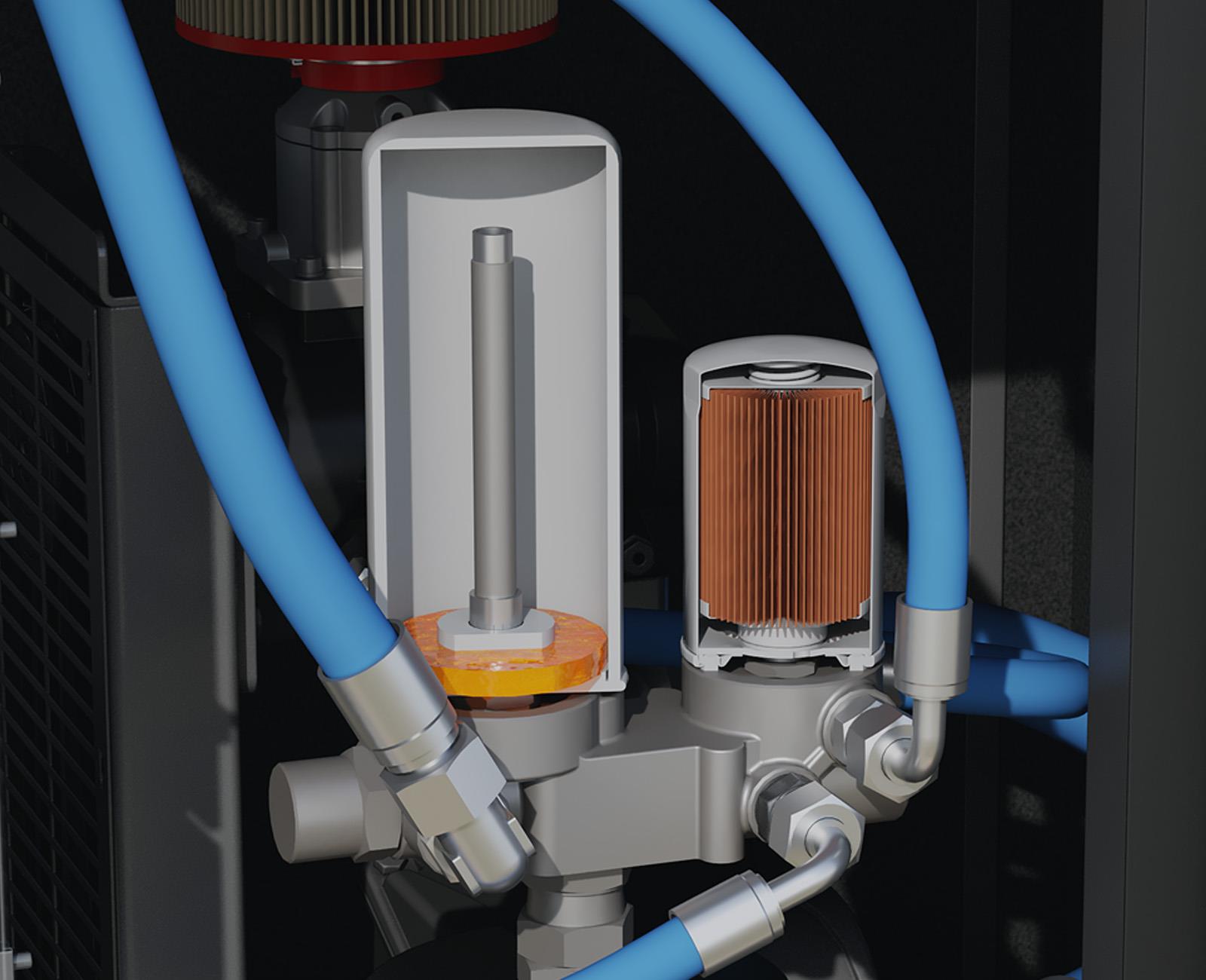 Etkili ayırma elemanı sayesinde kompresör çıkış havasında düşük yağ miktarı (1-3 mg/m³) ile kaliteli basınçlı hava